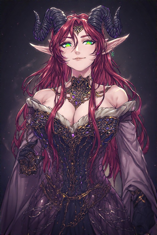 Thiryn Vael possesses a striking and otherworldly beauty marked by her fel-green hair streaked with shimmering purple highlights, flowing freely like liquid magic over her shoulders. Her skin is smooth, a dusky porcelain hue with faint lavender-gray undertones that betray her arcane origin. Her eyes glow a fierce fel green, burning with the intensity of her demonic pacts and ancient knowledge.
